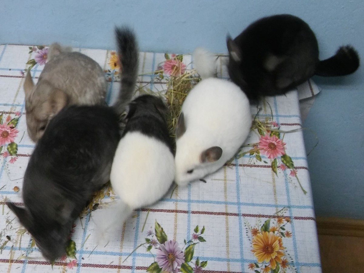 - შერჩეული ჩინჩილაები სხვადასხვა ტიპის: სტანდარტული, შავი ხავერდისფერი, კრემისფერი (ასევე თეთრი, აბონის, იასამნისფერი ფერები)